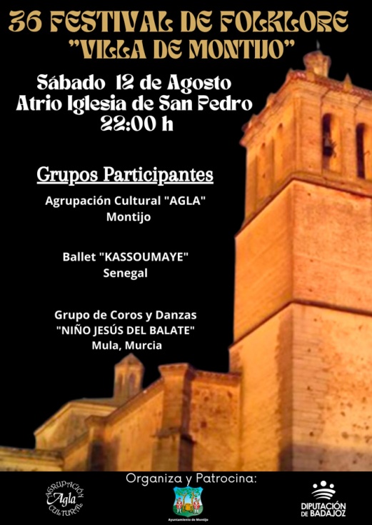 El Atrio de la Iglesia de San Pedro será el escenario en el que grupos folklóricos llegados de Murcia y de Senegal, acompañarán a la Agrupación Cultural Agla, de Montijo, para deleitar a los presentes, vecinos y visitantes, de una noche de bailes tradicionales en la celebración del 36 Festival de Folklore “Villa de Montijo”.