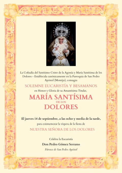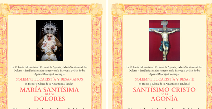 La Cofradía del Santísimo Cristo de la Agonía y María Santísima de los Dolores, de Montijo, celebra en honor Sagrados Titulares Solemne Eucaristía, con posterior Besamanos y Besapiés, según nos informan desde la propia Cofradía.