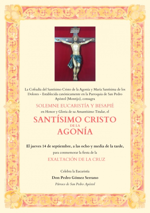 Esta celebración tendrá lugar en la Parroquia de San Pedro Apóstol, en Montijo, el jueves 14 de septiembre a partir de las 20:30 horas. En este día, la Iglesia celebra la Exaltación de la Santa Cruz, por lo que esta Cofradía conmemora con su crucificado, el Santísimo Cristo de la Agonía, la importancia del símbolo de la cruz para los cristianos.