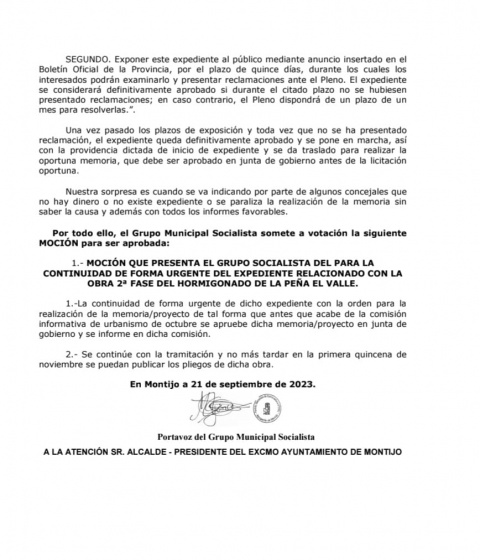El grupo municipal del Partido Socialista en el Ayuntamiento de Montijo presentará una moción para la continuidad de forma urgente del expediente relacionado con la obra de la segunda fase del hormigonado de la EF Peña el Valle, aprobado, según informan en la misma moción en el Pleno del mes de marzo de 2023 y de la que se fueron dando todos los trámites burocráticos de forma favorable.