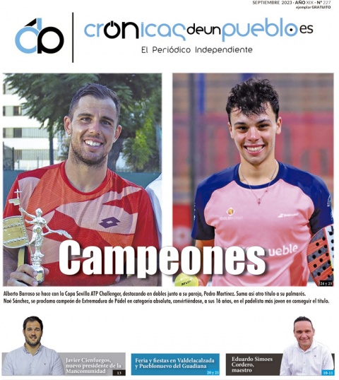 Protagonistas de esta primera página del número 227 de Crónicas de un Pueblo, Alberto Barroso Campos, con quien celebramos la consecución de un nuevo trofeo. Esta vez la Copa Sevilla ATP Challenges, en modalidad de dobles; y Noé Sánchez, que se proclama el padelista más joven en lograr el título de Campeón de Extremadura.