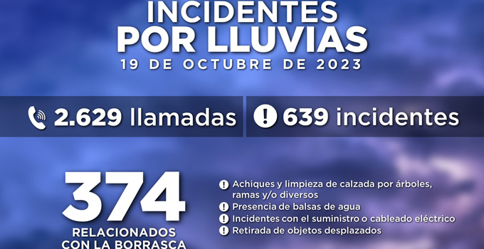 Estos incidentes han consistido, por una parte, en 324 asistencias técnicas motivadas por la necesidad de achiques, limpieza de calzada por árboles, ramas y/o diversos objetos que impiden la normal circulación; presencia de balsas de agua en la calzada, incidentes relacionados con el suministro o cableado eléctrico, y retirada de objetos desplazados tales como carteles, contenedores o plásticos.