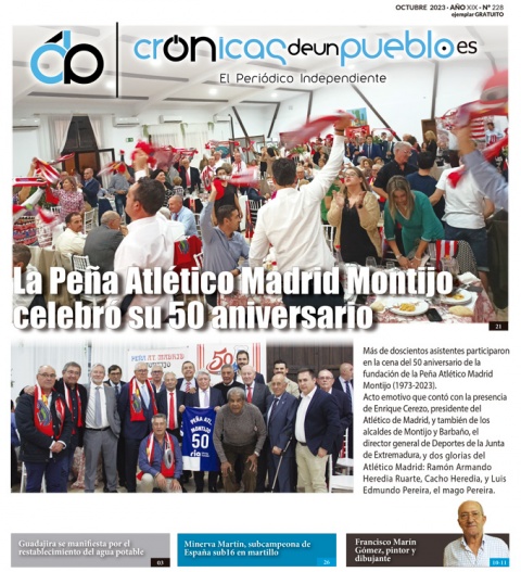 El aniversario de la Peña Atlético Madrid Montijo, que congregó en su celebración a más de 200 personas y que contó con la presencia del presidente del Atlético de Madrid, Enrique Cerezo, así como otras autoridades y antiguas glorias del club, es nuestro tema de portada.