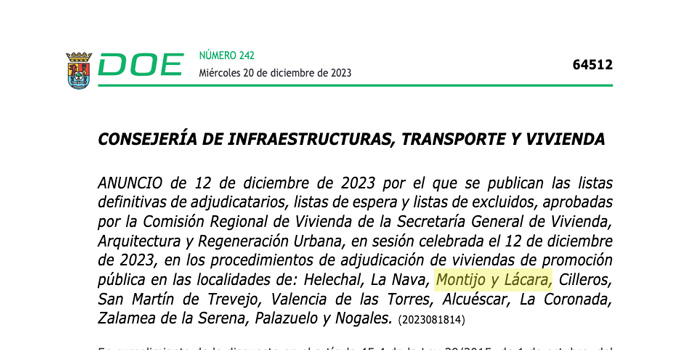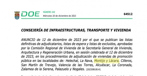 El DOE publica el anuncio de la Consejería de Infraestructura, Transporte y Vivienda con las listas definitivas de adjudicatarios, listas de espera y listas de excluidos, aprobadas por la Comisión Regional de Vivienda de la Secretaría General de Vivienda, Arquitectura y Regeneración Urbana, en sesión celebrada el 12 de diciembre de 2023, y en la que se adjudicaban a los solicitantes las viviendas de promoción pública en varios municipios de la región, entre ellos, Montijo y Lácara.