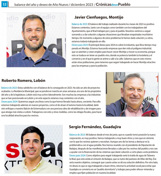 Balance de 2023: Mi balance desde el mes de junio, que es cuando tomó posesión la nueva corporación, es muy positivo. Vamos trabajando a muy buen ritmo y creo que en sintonía con lo que los vecinos quieren y necesitan. Aunque uno de los temas a destacar es la problemática con el agua potable. Nos hemos reunido con el presidente de Diputación de Badajoz, después de las manifestaciones llevadas a cabo por los vecinos del pueblo y nos van a ayudar con la financiación de las cisternas que darán solución a corto plazo a este problema