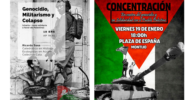 Ese mismo viernes, el catedrático en Historia Ricardo Sosa, miembro de Ecologistas en Acción y el Colectivo Cala, ofrecerá una charla en El Lokalino, en Montijo, bajo el nombre “Genocidio, Militarismo y Colapso”. Tras esta charla, que será a las 19:30 horas, habrá una cena solidaria a favor de Palestina.