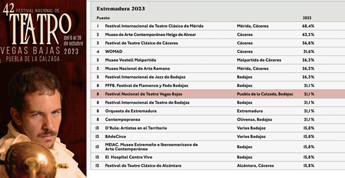 Un año más, el Festival Nacional de Teatro “Vegas Bajas”, que se celebra en Puebla de la Calzada, dentro del ranking de los 10 eventos culturales mejores valorados en toda la comunidad autónoma de Extremadura, del 2023, según el Observatorio de la Cultura de la Fundación Contemporánea de Madrid.