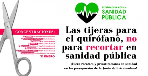 Por todo ello, afirman que “estamos a tiempo de corregir este atropello al pueblo extremeño antes de la aprobación definitiva de estos presupuestos injustos”, por lo que invitan “a toda la sociedad extremeña a sumarse a las concentraciones” que desde la plataforma han convocado en los siguientes municipios: por la mañana en Badajoz a las 11 horas, en el Hospital Perpetuo Socorro; Navalmoral de la Mata a las 11 horas, en el ambulatorio; Miajadas a las 11 horas, en el centro de salud; y Montijo a las 11 y media, en el centro de salud. Por la tarde, las concentraciones seguirán en Don Benito a las cinco y media, en el Hospital Comarcal; Valencia de Alcántara a las cinco y media, en el centro de salud; Olivenza a las 18 horas, en la Plaza de España; y Almendralejo a las siete y media, en la Plaza de Espronceda.