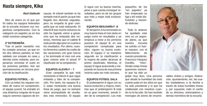 Todo lo anterior ha quedado este mes es un segundo plano, ya que nuestra escuela ha sufrido un fuerte mazazo, con el fallecimiento de nuestro presidente, Francisco Vázquez Gordillo, “Kiko”. Desde estas líneas queremos transmitir que ha sido un golpe muy duro. Una persona que desde la humildad dio todo cuanto pudo en los años en que ha sido presidente y lo que ha colaborado con nosotros cuando no lo ha sido. Se han recibido mensajes de ánimo de innumerables clubes y amigos, federación, ayuntamiento, etc. las cuales trasladamos a la familia a través de estas humildes líneas y, por supuesto, todo el cariño de su directiva, entrenadores y demás miembros de la escuela.
