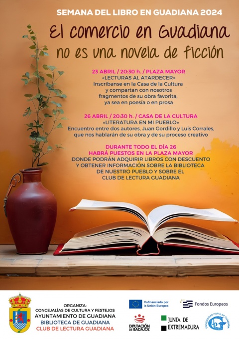 Las Concejalías de Cultura y Festejos del Ayuntamiento de Guadiana, en colaboración con la Biblioteca Municipal y el Club de Lectura Guadiana, organiza una serie de actividades en la Semana del Libro, que se desarrollará los días 23 y 26 de abril.