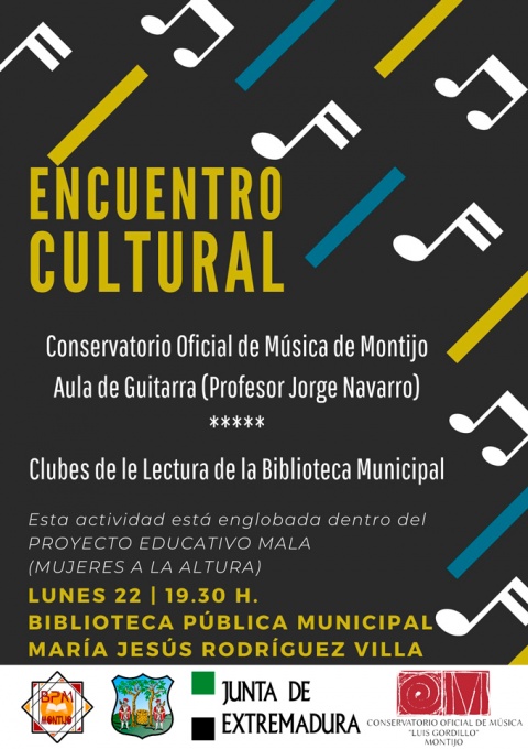 Esta semana en concreto dará inicio con el II Encuentro Cultural entre los alumnos del aula de guitarra de Jorge Navarro, pertenecientes al Conservatorio Profesional de Música de Montijo y los miembros del Club de Lectura de la biblioteca. Tras el éxito del año anteior, se repite la experiencia de este intercambio, esta vez con lecturas de mujeres poetas ya que la actividad forma parte del proyecto educativo MALA (Mujeres A La Altura). La cita será a partir de las 19.30 h.