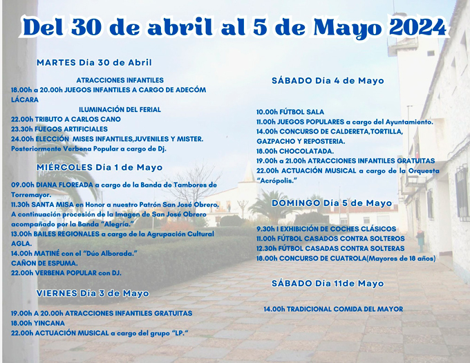 Durante los días en que los lacareños celebran su feria, habrá juegos y atracciones infantiles, fuegos artificiales, elección de miss y míster, actuaciones musicales, deporte, chocolatada, caldereta, tortilla, gazpacho, exhibición de coches clásicos y concurso de cuatrola entre otras actividades.