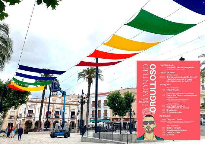 Este fin de semana se celebra “Montijo orgulloso”, una celebración a la diversidad para la que la Plaza de España se ha engalanado con la instalación de telas de colores que servirán tanto de decoración como para dar puntos de sombra.