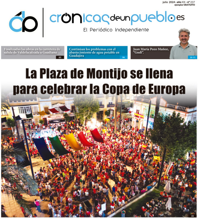 El número 237 del periódico líder en información de las Vegas Bajas destaca en portada el lleno de la Plaza de España de Montijo, punto de reunión de muchos vecinos para ver la final de la Eurocopa de España, en la pantalla dispuesta para tal fin con el Ayuntamiento.