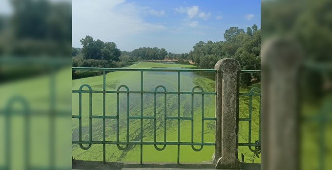 El río Guadiana, a su paso por el Puente de los Suspiros, presenta de nuevo mal aspecto. A ambos lados del puente, se puede ver un manto de un color verde intenso que se extiende en una gran superficie, que parece similar a un manto de algas.