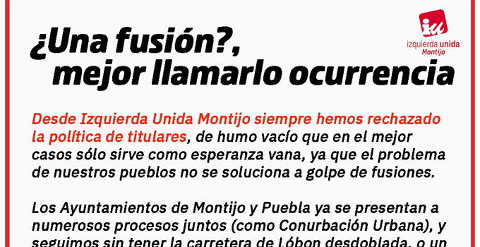Izquierda Unida Montijo envía una nota de prensa que bajo el título "¿Fusión? Mejor llamarlo ocurrencia" muestra la postura del grupo municipal ante todo lo acontecido estos días en torno a las declaraciones del alcalde de Montijo, Javier Cienfuegos, acerca de una posible fusión entre Montijo y Puebla de la Calzada y la posterior respuesta de Juan Mari Delfa, alcalde poblanchino.