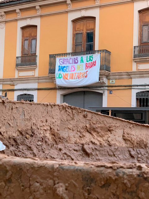 Pero lo que más impacto les causa es el agradecimiento de la gente. Allá donde vayas o donde mires, hay una palabra de agradecimiento de los vecinos, un dibujo hecho por niños dando gracias por la ayuda, o carteles en los escaparates para que todos los voluntarios que están sobre el terreno estos días sepan que su tiempo y su trabajo, cala en la gente.