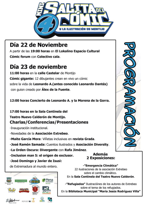 La 4ª Mini Salita del cómic y la Ilustración de Montijo se celebra en Montijo los días 22 y 23 de septiembre. Un evento organizado por Extrebeo en colaboración con Plena inclusión Montijo, que pretende hacer a la localidad referente a nivel nacional