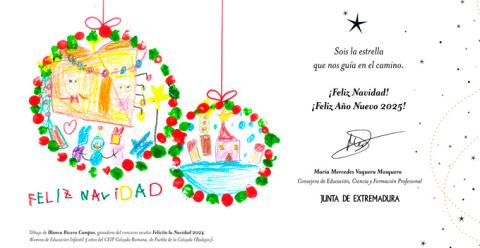 La ganadora del concurso en categoría de Educación Infantil ha sido también una alumna de las Vegas Bajas, Blanca Rivero Campos, alumna de Educación Infantil 5 años del CEIP Calzada Romana. Su dibujo fue el que se envió desde la Consejería de Educación para felicitar las fiestas a la comunidad educativa.
