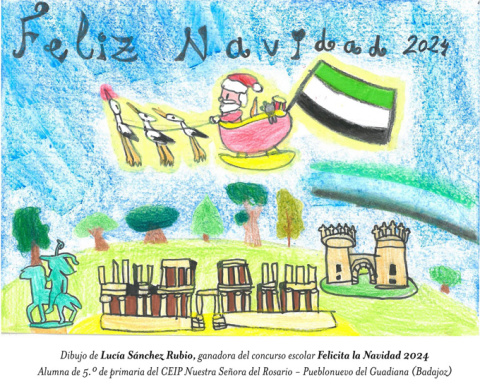 El dibujo en cuestión es de Lucía Sánchez Rubio, alumna de 5º de Primaria del CEIP Nuestra Señora del Rosario, de Pueblonuevo del Guadiana, y ganadora del concurso escolar Felicita la Navidad 2024 en Educación Primaria.