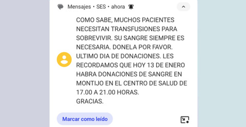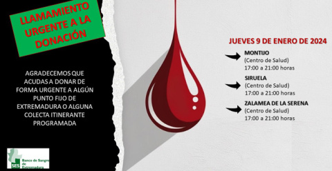 En Montijo continúan las donaciones de sangre. Los días 9, 10, 11 y 13 de enero, una unidad del Banco de Sangre de Extremadura estará en el Centro de Salud Montijo-Puebla de la Calzada en horario de 17:00 a 21:00 horas para efectuar las extracciones a los donantes de la zona.