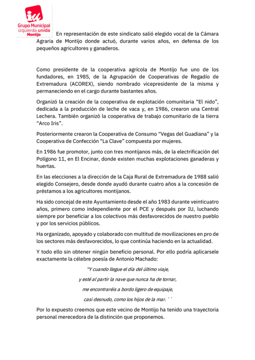 En la exposición de motivos que lleva en su propuesta, el grupo de izquierdas hace repaso de la vida de Alonso Rodríguez, de quien destaca su lucha por los colectivos más desfavorecidos de Montijo así como por los servicios públicos "todo ello sin obtener ningún beneficio personal".