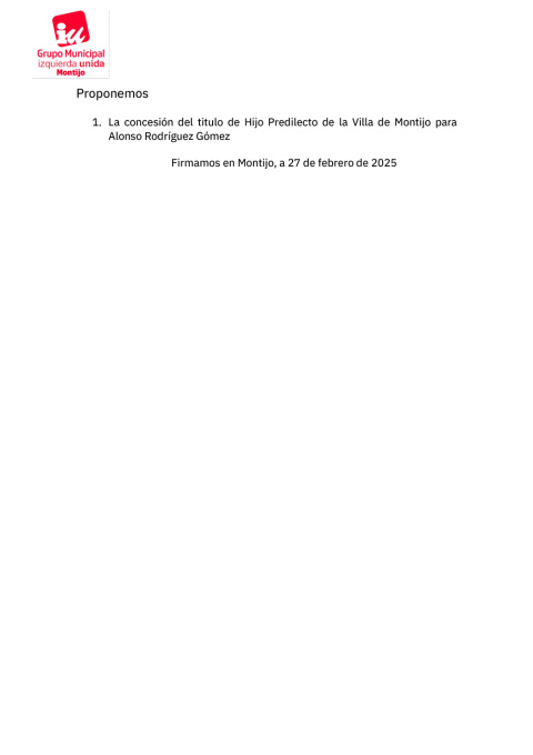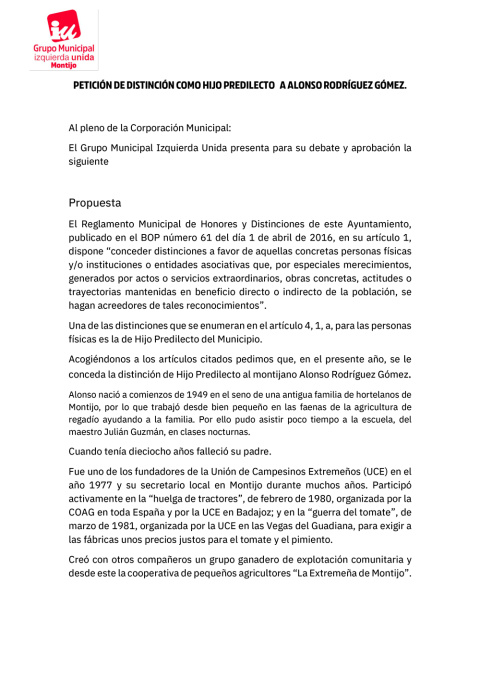 El Grupo Municipal Izquierda Unida en Montijo presenta una petición al Pleno Ordinario que se celebra hoy miércoles a las 20:00 horas en el Ayuntamiento de Montijo por la que solicita la distinción como Hijo Predilecto a Alonso Rodríguez Gómez.