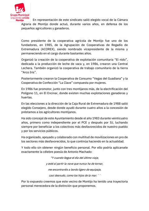 IU Montijo solicitará al Pleno la distinción como Hijo Predilecto a Alonso Rodríguez Gómez