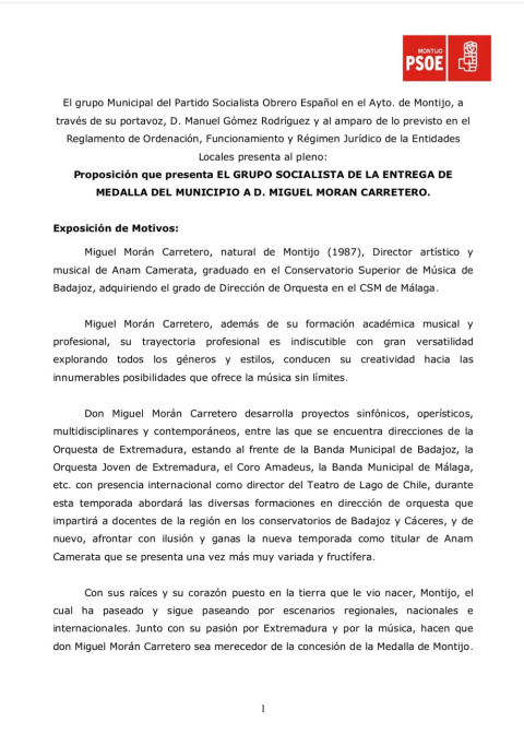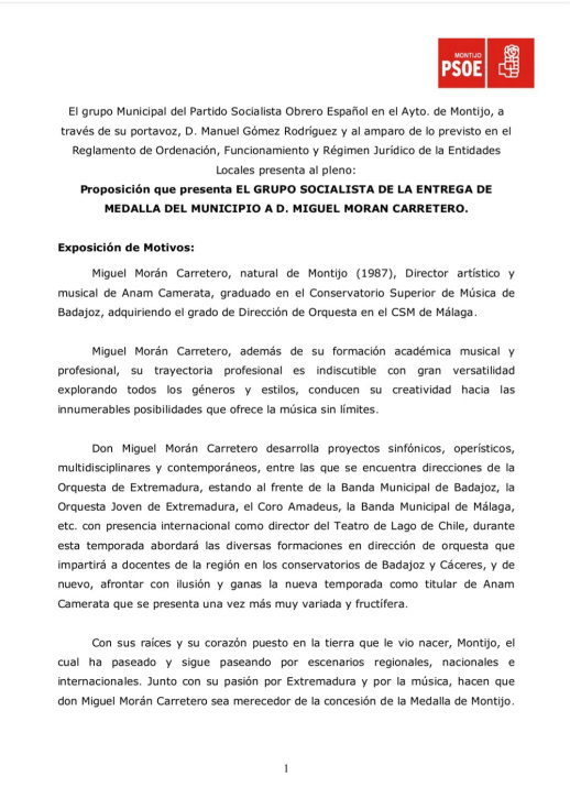 El PSOE de Montijo solicitará al Pleno del Ayuntamiento de Montijo la aprobación de la entrega de la Medalla del municipio al músico Miguel Morán Carretero.