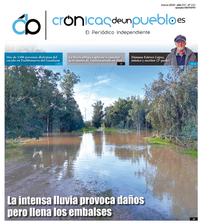 El periódico con las noticias del mes de marzo, que hace el número 245 en edición impresa, trae en portada una imagen del río Guadiana a su paso por Valdelacalzada. No podía ser de otro modo, el tema principal de este número es el de las insistentes lluvias que hemos tenido durante todo el mes de marzo y que han obligado a suspender actividades y a pedir a la población especial precaución en sus salidas en zonas cercanas a ríos, arroyos, etc.