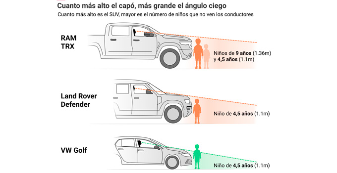En la práctica, el aumento de la altura del morro tiene consecuencias muy concretas y peligrosas. Las pruebas encargadas para el informe revelan que, desde el asiento del conductor de vehículos de gran tamaño, no se puede ver a una niña o niño de hasta nueve años que se encuentre justo delante del coche. Modelos más comunes de SUV, como el Land Rover Defender, tampoco permiten ver a menores de hasta cuatro años y medio.