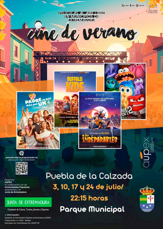 Una nueva edición del Cine de Verano llega a Puebla de la Calzada durante el mes de julio 2025, a través de la Universidad Popular, Ayuntamiento y AUPEX, con la colaboración de la Consejería de Cultura, Turismo, Jóvenes y Deportes de la Junta de Extremadura.