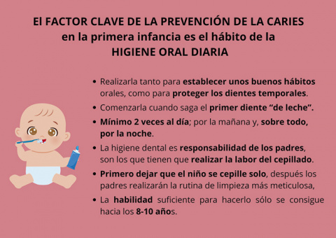 Los factores que influyen en la aparición de la caries son la insuficiente higiene oral; el biberón o lactancia materna a demanda, especialmente si es nocturna, sin higiene posterior; consumo frecuente de alimentos y/o bebidas azucaradas; bajo nivel socio-económico de los padres y/o pocos conocimientos sobre salud oral.