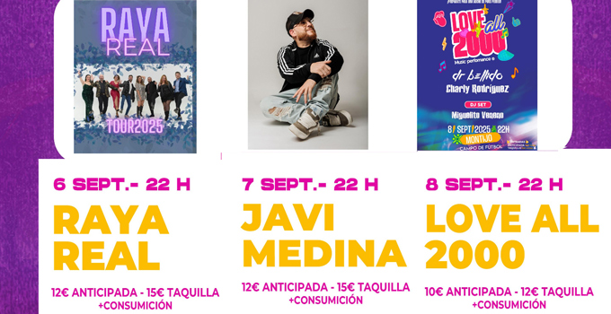 Así, el campo de fútbol de tierra acogerá los conciertos de Raya Real, Javi Medina y la sesión DJ de Dr. Bellido y Charly Rodríguez con Love All 2000, los días 6, 7 y 8 respectivamente.