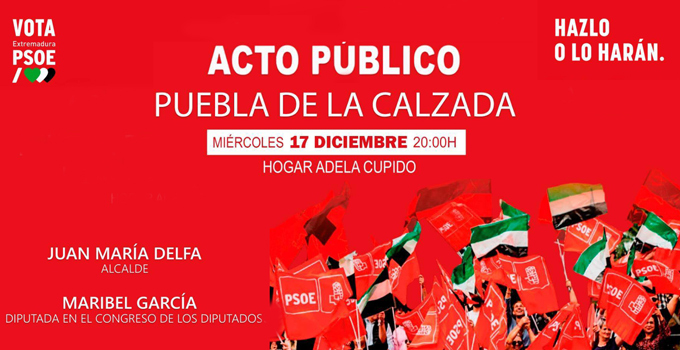 Puebla de la Calzada acoge la tarde del miércoles 17 de diciembre un acto público del Partido Socialista Obrero Español en el que intervendrán Juan María Delfa, alcalde de Puebla de la Calzada, y Maribel García, Diputada en el Congreso de los Diputados.