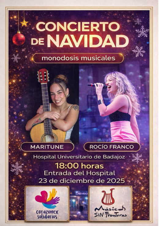 El martes 23 de diciembre, a las 18:00 horas, el Hospital Universitario de Badajoz se llenará de música, emoción y cercanía con la celebración de un Concierto de Navidad que tendrá lugar en la entrada principal del hospital.