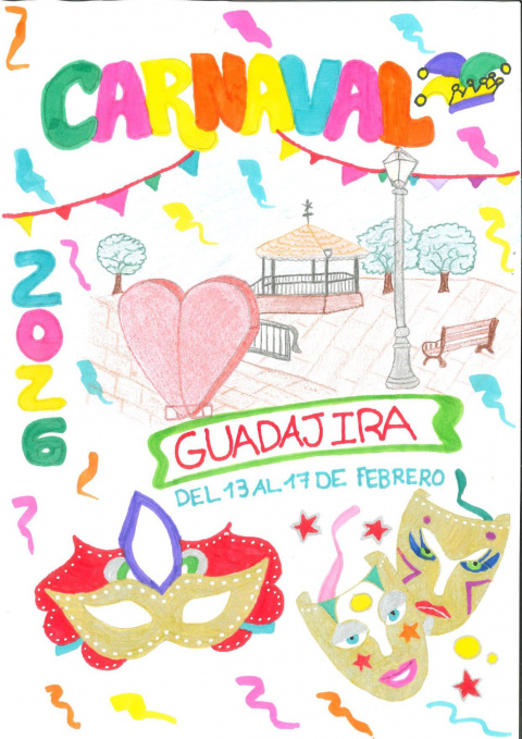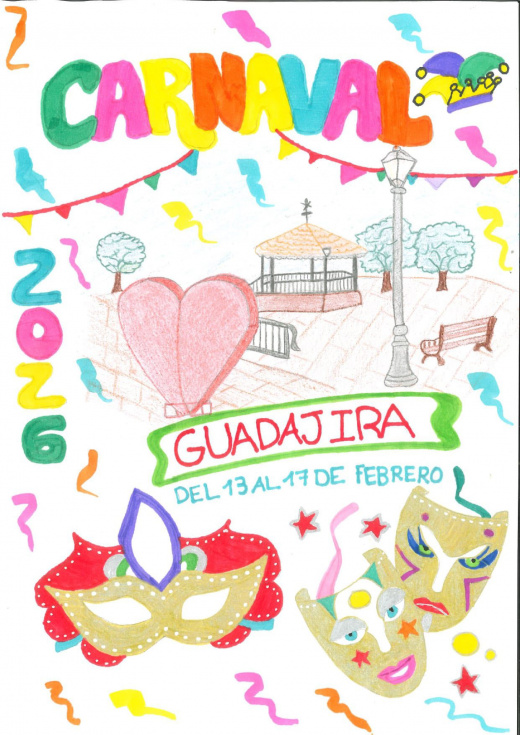Marcos Flores, alumno del CEIP San José, de Guadajira, ganó el concurso de diseño del cartel de carnaval de Guadajira. El dibujo del pequeño presentaba una imagen del pueblo, con varias localizaciones del municipio, acompañado de diversos motivos de Carnaval: gorros, máscaras, antifaz y confeti. Un dibujo colorido por el que recibía su premio de manos del alcalde de Guadajira, Sergio Fernández Aguado.