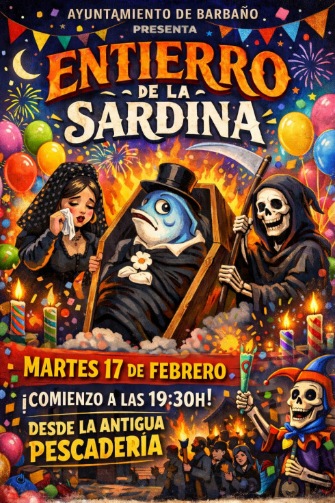 En Barbaño el desfile se inicia con entrega de chucherías a los niños inscritos en el desfile que vayan vestidos de negro o de carnaval. A las 19:30 horas los vecinos acompañarán a la sardina desde la antigua pescadería hasta la Caseta Municipal. Al finalizar, habrá tamborada a cargo de Los Pirulfos y actuación de la murga “Sa Tersiao”, de Talavera la Real, en el Centro Cultural.