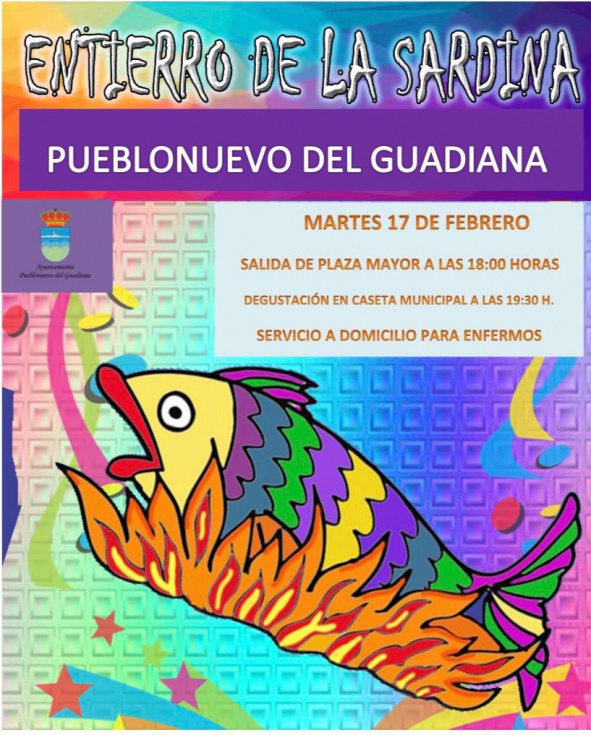En Pueblonuevo del Guadiana el lugar de salida del Entierro de la Sardina será la Plaza Mayor, donde se reunirá el cortejo fúnebre a las 18:00 horas. a partir de las 19:30, en la Caseta Municipal, habrá degustación de sardinas. El Ayuntamiento señala, además, que habrá servicio a domicilio para las personas que estén enfermas.