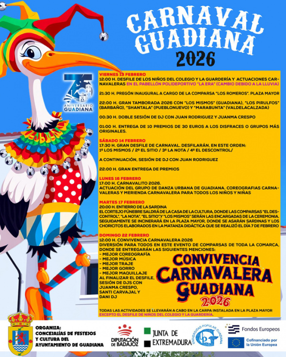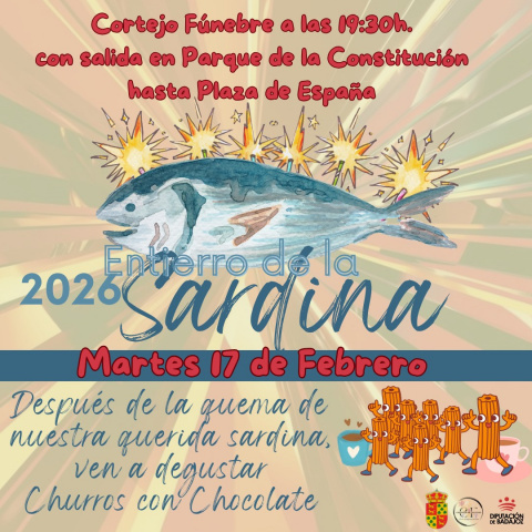 El cortejo fúnebre en Guadajira se dará cita a las 13:00 horas en la puerta del Ayuntamiento, dirigiéndose hacia el mirador, donde quemarán la sardina para despedir el Carnaval. Tras la quema, sardinas y migas para todos los asistentes.