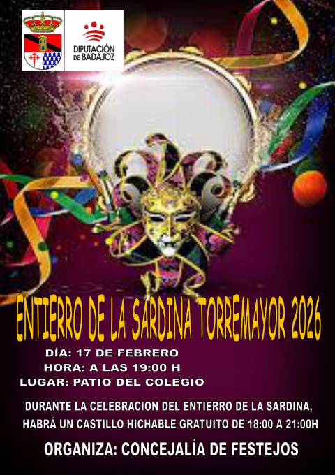 Torremayor hará el recorrido un poco antes. La comitiva fúnebre saldrá a las 17:00 horas desde el Centro Médico y recorrerán varias calles hasta el CEIP San Juan, donde habrá castillo hinchable gratis para los niños desde las 18:00 horas. A las 19:00 empezará el reparto de sardinas, vino y refrescos.