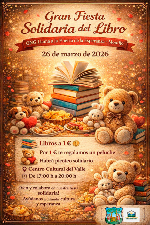 La ONG Llamando a la Puerta de la Esperanza, organiza una Gran Fiesta Solidaria del Libro, en la que se pondrán a la venta libros al precio de 1 euros. En este mismo evento se regalarán peluches por un donativo de 1 euros a la ONG, habiendo también un picoteo solidario.