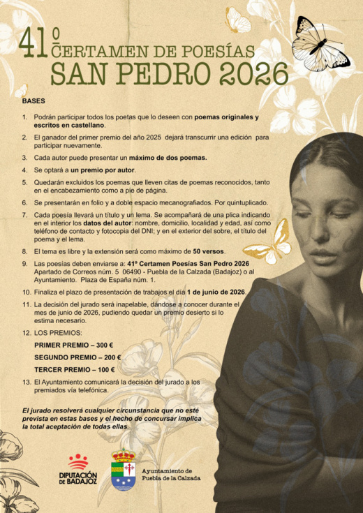 La concejalía de Cultura, con el patrocinio del Ayuntamiento de Puebla de la Calzada, convoca el “41º Certamen de Poesías San Pedro”, de acuerdo con las siguientes bases: